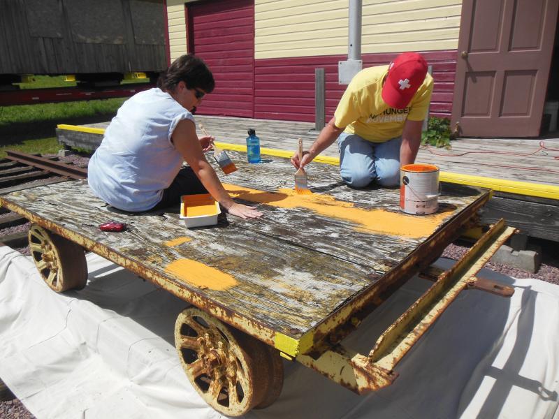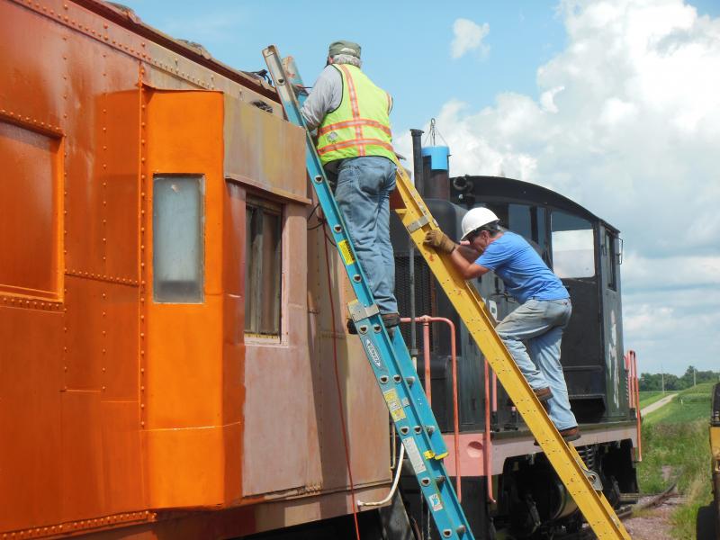 Volunteers have been busy giving the Milwaukee Road caboose a much needed make over. Soon the faded orange, now almost pink paint will give way to bright orange once again.