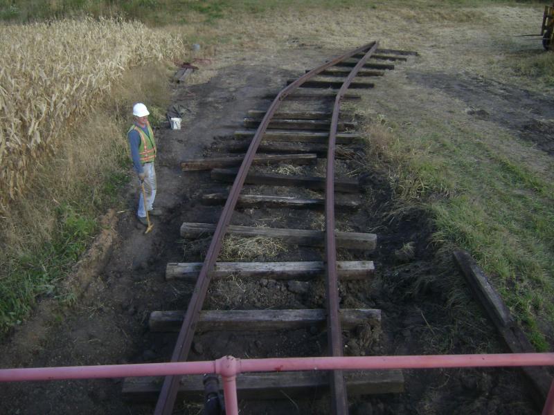 Volunteers started buidling temporary track late summer 2011 in order to move NSP 4 to the siding to join CB&Q 14534 and the shop car.