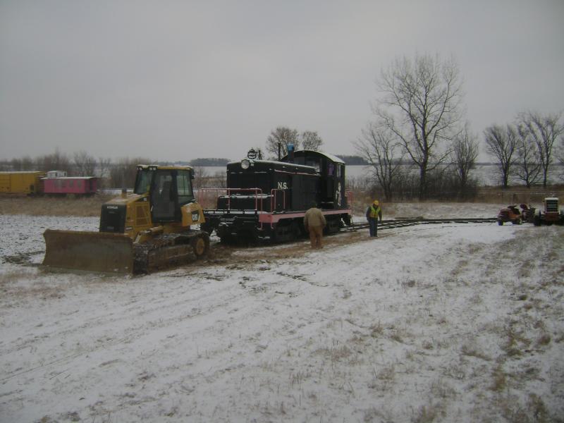 Since NSP 4 wasn't yet operational again after moving it by truck, a bulldozer was employed to move it. A gas powered air compressor provided a source of charge air for NSP4's air system so its brakes were available.